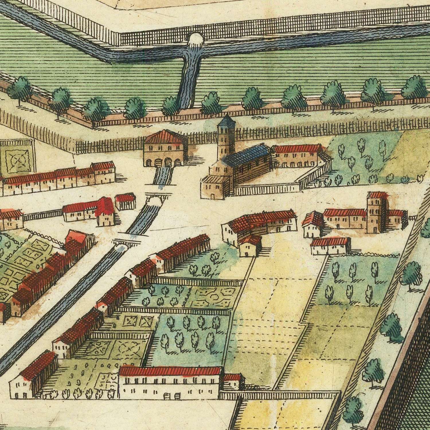 The fortifications command immediate attention. Lucca’s bastioned polygon—artillery-era engineering at its most refined—unfurls as a choreography of curtains, angular bulwarks, and a capacious moat, each element calibrated to deflect and absorb attack. Merian’s composition emphasizes the mathematical harmony of the walls, a Renaissance ideal applied to defense, while also revealing the practicalities of control: outworks and glacis, the clear sweep of firing lines, and the measured intervals of gates punctuating the circuit. Beyond the ramparts, the open plain underscores the city’s strategic siting on the Serchio basin; within, the secure interior testifies to a government that invested in enduring, meticulous protection of commerce and civic life.