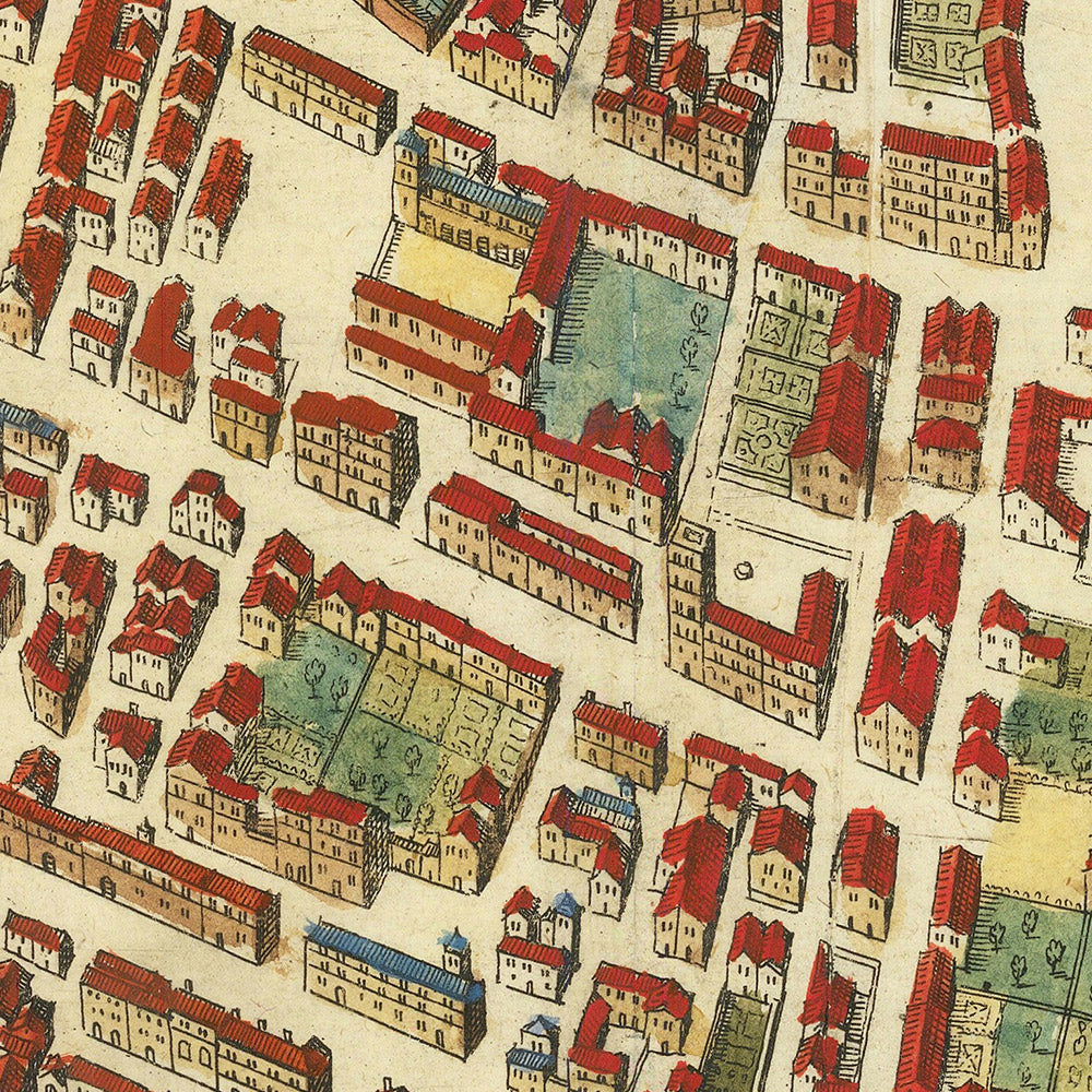 Within this protective ring, the street plan is a study in historical layers. Medieval lanes—Via Buia, Via dei Fogli, and Via delle Monache—thread intimately between parish churches and cloisters, while broader Renaissance spines such as Via Larga and Via di Mezzo impose clarity and flow. Merian’s labeling records the city’s working anatomy: Via della Zecca speaks to minting and governance; Via del Sarto to specialized crafts; Via del Giardino and Via della Rodia hint at gardens, orchards, and irrigation. The urban fabric coheres around nodal spaces: the cathedral precinct; the market radiating from the Piazza dell’Anfiteatro’s graceful ellipse; and administrative courts embedded among guild streets. As a document of urban design, it reveals how circulation, trade, and ritual were elegantly choreographed inside the walls.