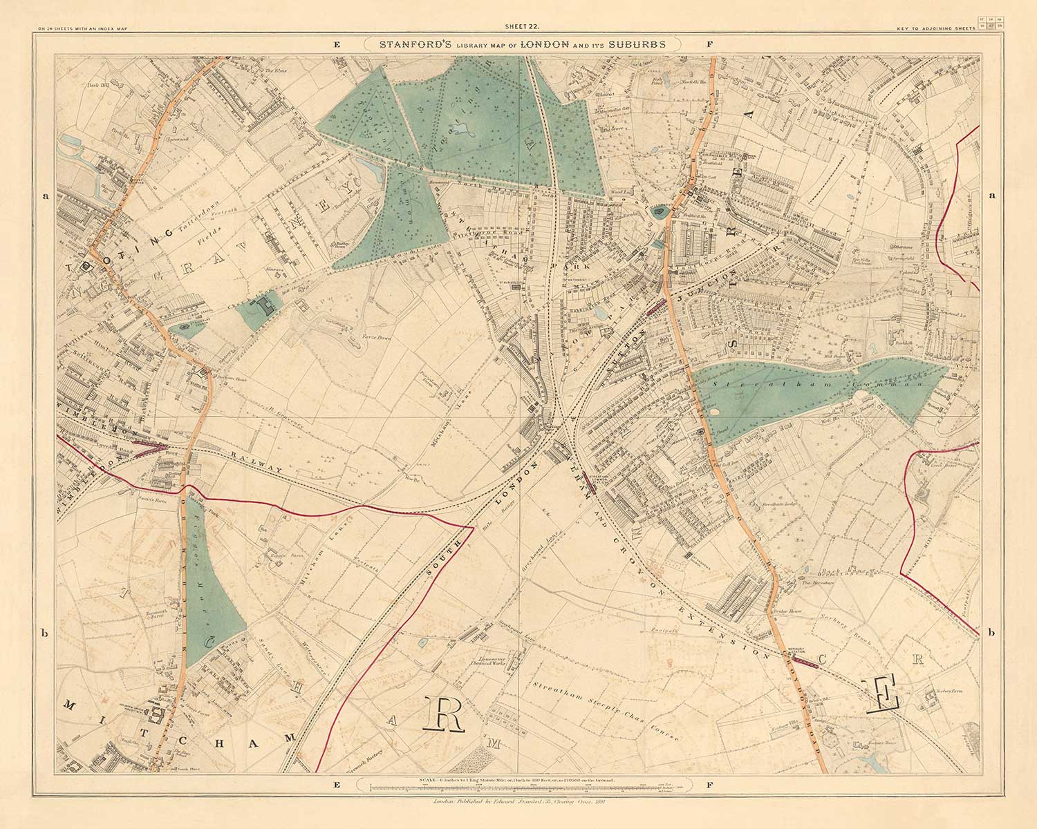 El mapa se publicó originalmente en 24 hojas. En total, el mapa habría medido aproximadamente 2 metros de ancho (78 pulgadas). Este aquí es la hoja 22, que se centra en las ciudades de Tooting y Streatham en los distritos del sur de Londres de Wandsworth y Lambeth.