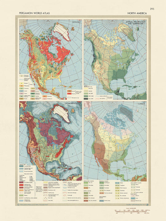 El mapa se centra principalmente en las características geológicas de América del Norte y muestra una gran cantidad de información mediante el uso de colores, patrones y símbolos. Se representan meticulosamente varios tipos de rocas y formaciones geológicas, proporcionando una visión completa de la diversidad geológica del continente. Además, el mapa presenta cuatro mapas infográficos más pequeños, cada uno de los cuales profundiza en aspectos específicos de la geología, el clima, la geomorfología y las precipitaciones y temperaturas anuales de América del Norte. Estos mapas adicionales mejoran el valor general del mapa principal y ofrecen una comprensión más completa de las características físicas del continente.