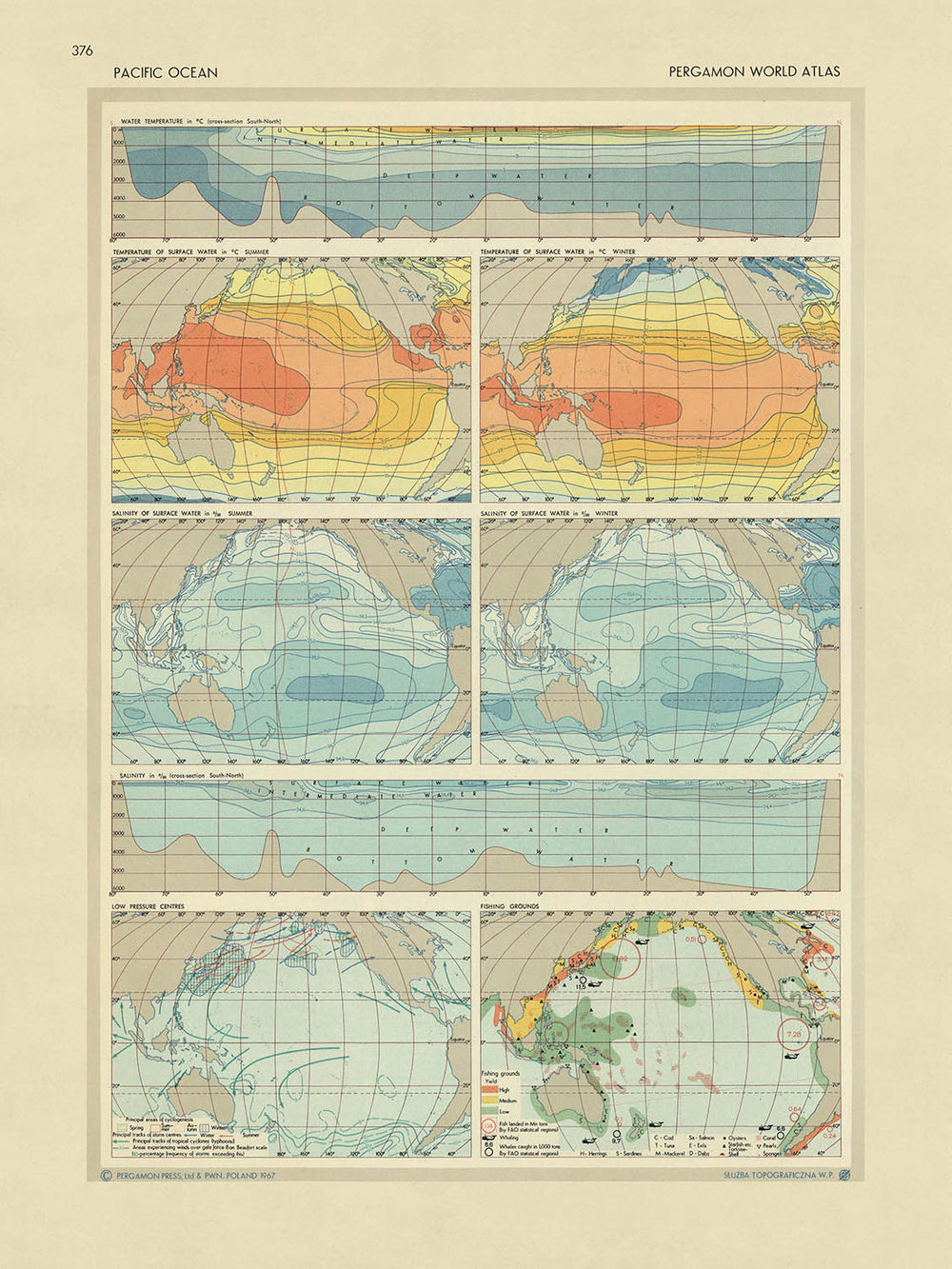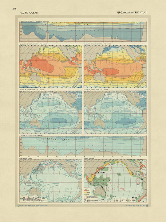 - Ocho mapas y gráficos que muestran atributos del Océano Pacífico: sección transversal de temperatura, sección transversal de salinidad, salinidad y temperaturas estacionales, áreas de baja presión y pesquerías.