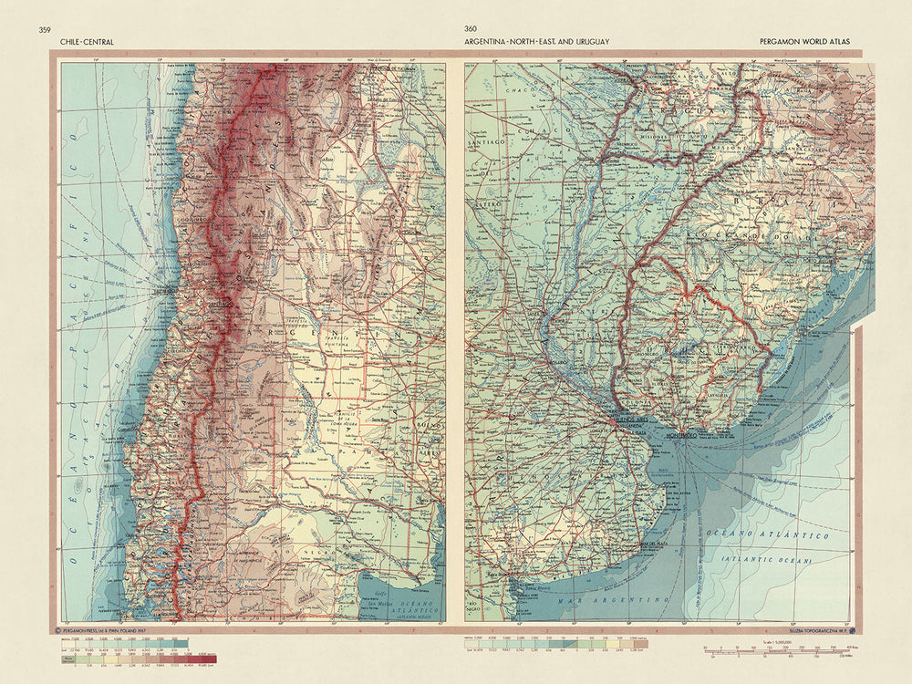 Este mapa de 1967 de Chile - Central, Argentina - Noreste y Uruguay es un mapa político y físico detallado producido por el Servicio de Topografía del Ejército Polaco. Es un conjunto de dos mapas, con "Chile - Central" a la izquierda y "Argentina Noreste y Uruguay" a la derecha. El mapa es un fascinante documento histórico que proporciona una gran cantidad de información sobre la región.