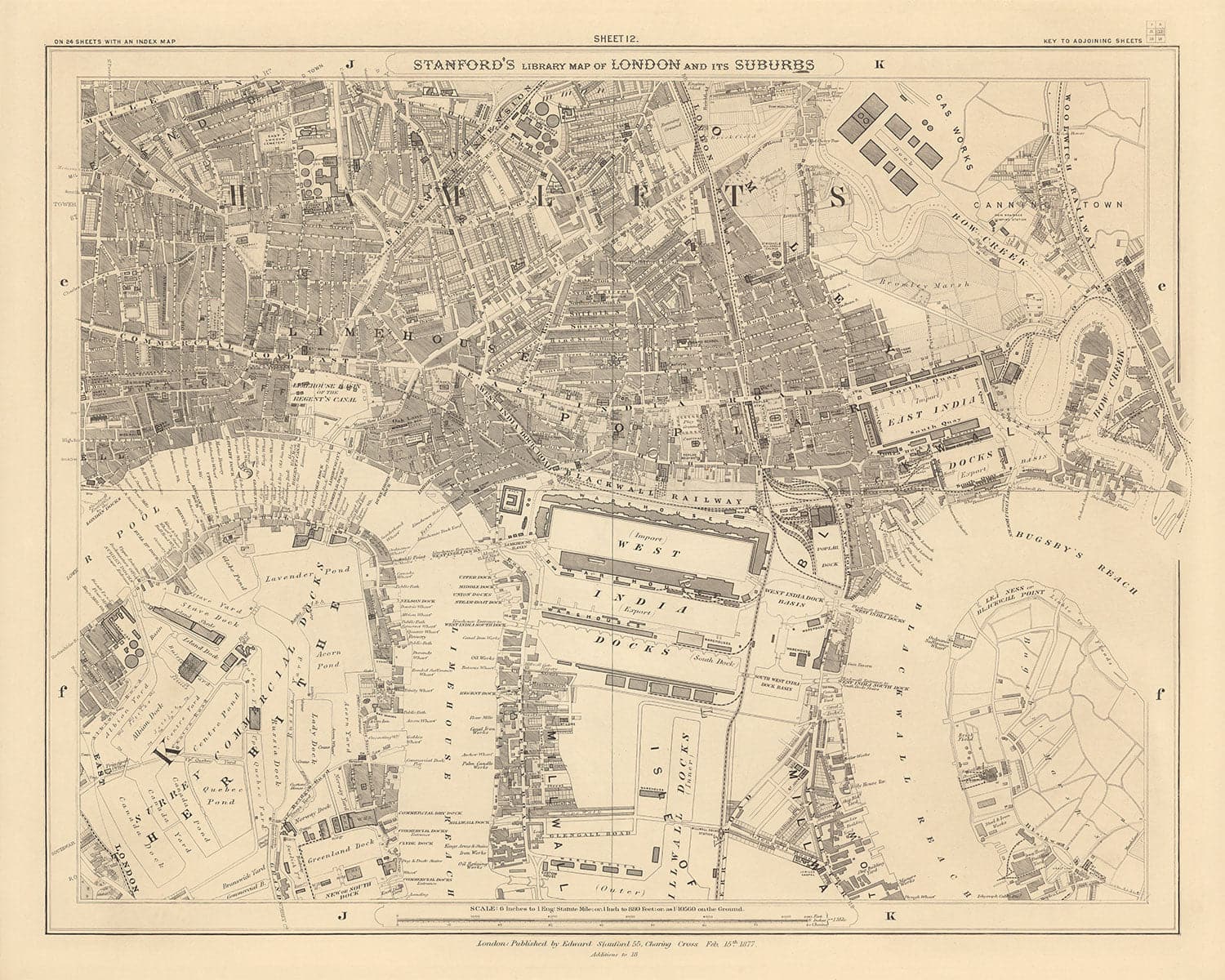 El mapa fue publicado originalmente en 24 hojas. En total, el mapa habría medido aproximadamente 2 metros de ancho (78 pulgadas). Esta aquí es la hoja 12, que se centra en las áreas del este y sureste de Londres de Tower Hamlets, Limehouse, Poplar, Bow, Isle of Dogs, Surrey Quays y Rotherhithe - con un poco de Greenwich en la esquina inferior derecha (¡donde está el O2 hoy!)