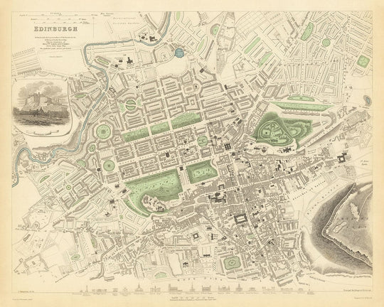 El Water of Leith está coloreado de un hermoso azul y serpentea a lo largo del lado izquierdo del mapa. Una grabado altamente detallado del Castillo de Edimburgo está insertado a la izquierda.