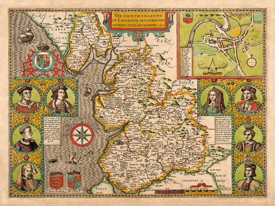 Muchos de los pueblos, aldeas y ciudades de Lancashire ya son visibles en este mapa. En la esquina superior derecha hay un grabado detallado de Lancaster, que entonces (y todavía) era la capital de este antiguo condado.