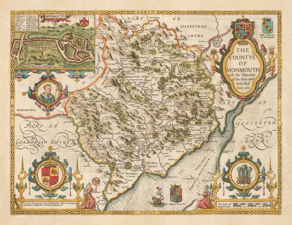 Muchos de los pueblos, aldeas y ciudades en Monmouthshire ya son visibles en este mapa, incluyendo Abergavenny, Chepstow, Caldicot y otros. En la esquina superior izquierda hay un hermoso grabado detallado de la ciudad de Monmouth.