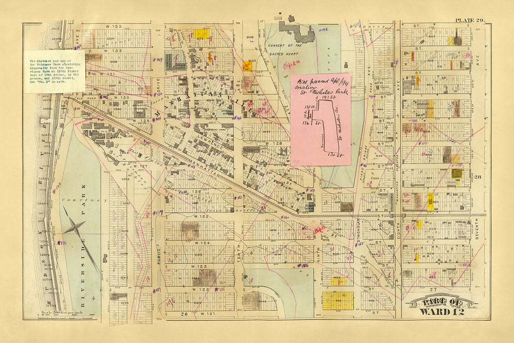 Mapa antiguo de Harlem, NYC por Bromley, 1879: Parque Riverside, convento, Broadway, ferrocarriles, Avenida Ámsterdam
