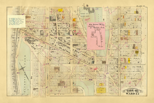 "Parte del Distrito 12, Ciudad de Nueva York", un exquisito mapa elaborado por el estimado GW Bromley en 1879, ofrece una visión fascinante del tejido urbano de Nueva York a finales del siglo XIX. Este plano de calles de la ciudad, meticulosamente detallado, captura la esencia de una metrópolis en rápida evolución, mostrando el intrincado diseño de calles, lotes y edificios que definieron el Distrito 12. La elegancia dibujada a mano del mapa y las secciones codificadas por colores brindan una representación vívida de las áreas residenciales, comerciales e institucionales, lo que lo convierte en un artefacto cautivador tanto para historiadores como para entusiastas urbanos.