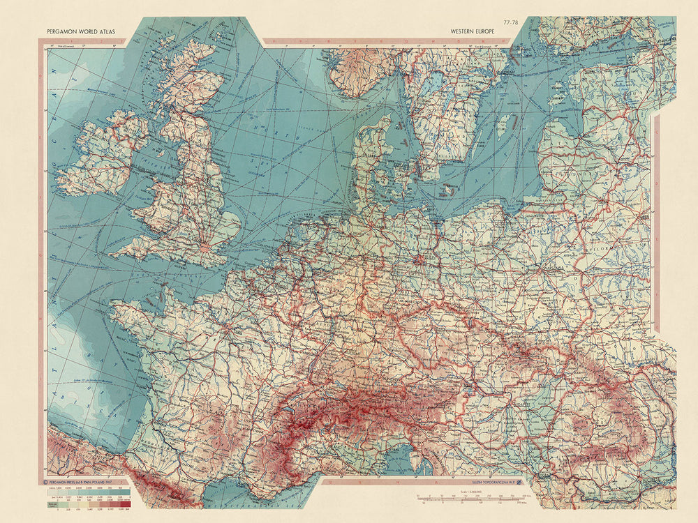 Este mapa de Europa Occidental, publicado originalmente en 1967 por el Servicio de Topografía del Ejército Polaco, es un mapa político y físico detallado que cubre un área desde las Islas Británicas en la esquina superior izquierda hasta Rumania en la esquina inferior derecha. Incluye rutas de navegación y muestra las fronteras políticas de Europa en 1967, lo que lo convierte en un documento histórico interesante así como una hermosa pieza de cartografía.