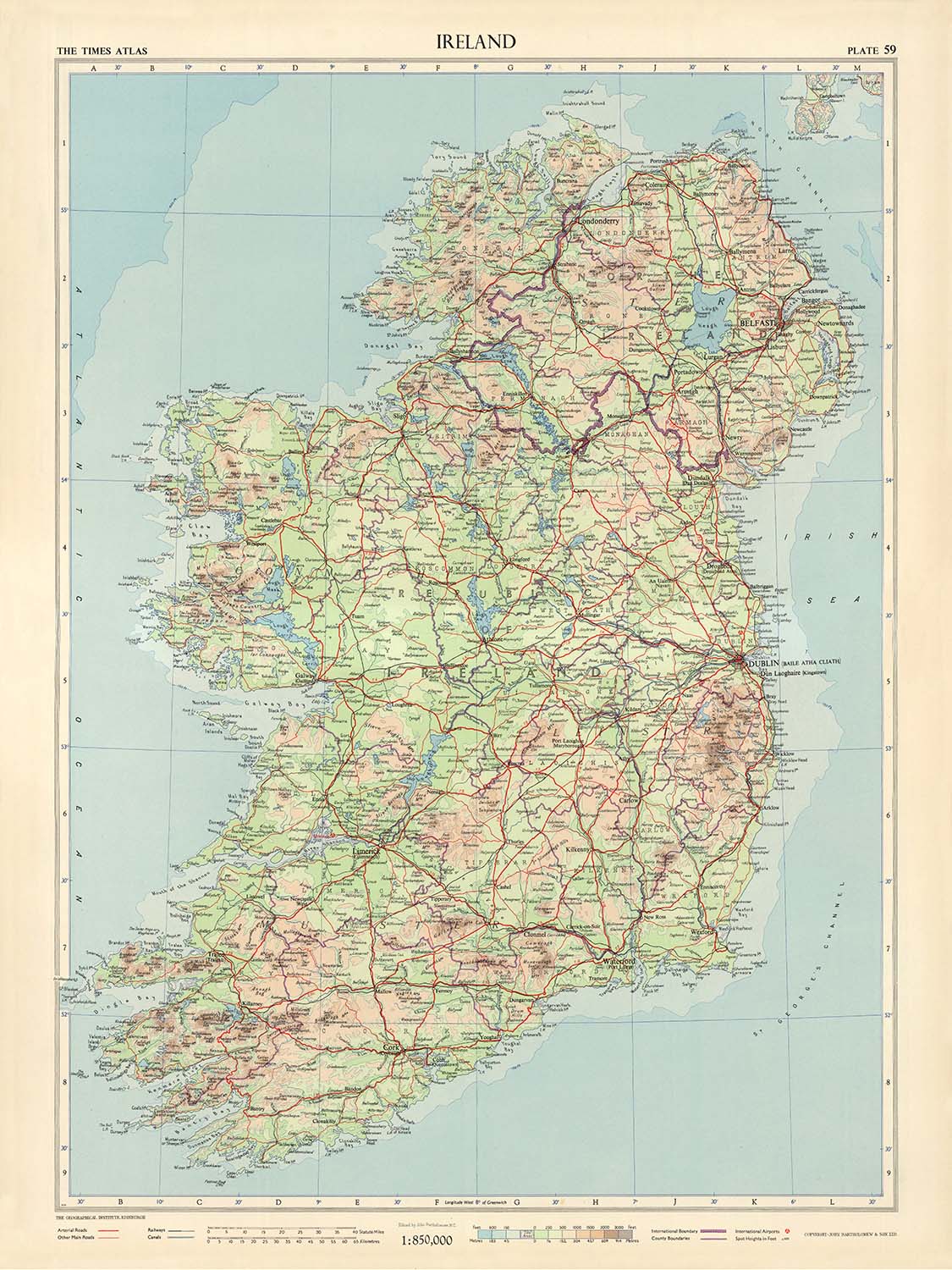 Ireland, Plate 59, V. III presents a poised mid-century portrait of the island, drawn in 1955 under the exacting eye of John Bartholomew for The Geographical Institute, Edinburgh. It is a political and physical synthesis: provinces and borders delineated with crisp assurance, while a sophisticated scheme of gradient tints and spot heights sculpts the uplands and plains. Depth is treated with equal finesse, coastal waters around the Atlantic, the Irish Sea, and the North Channel subtly stepped by soundings and marine tints. A finely graded road network—major routes and secondary ways alike—threads the cities and market towns from Dublin to Cork, Limerick to Galway, Waterford to Wexford, with Kilkenny, Sligo, Derry, Armagh, Antrim, and Louth also clearly set. The Greenwich prime meridian governs the longitudinal framework, signaling a work that marries global standards to local precision.