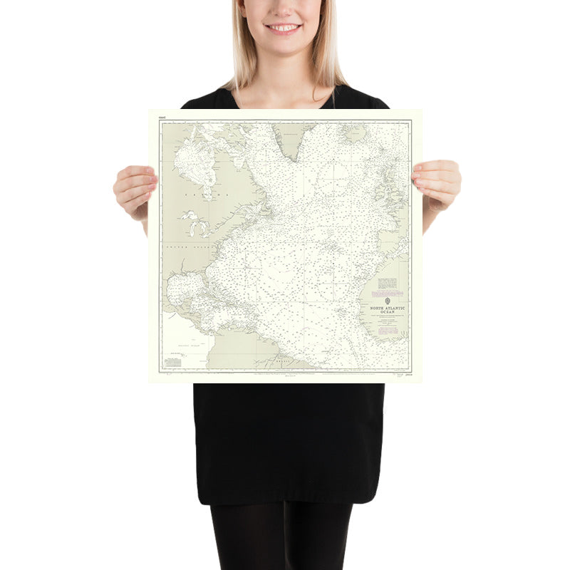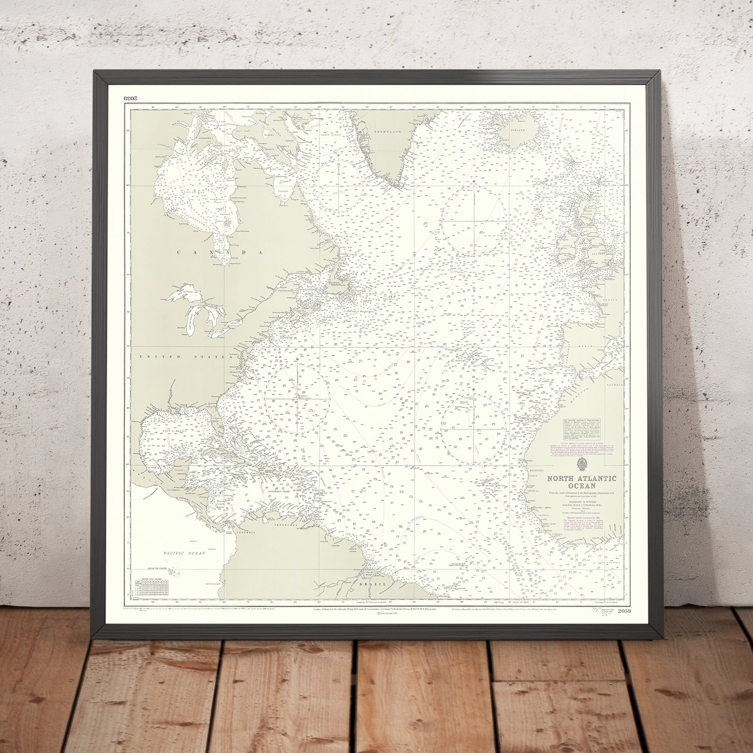 As a product of the British Admiralty—whose Hydrographic Office set the global standard for sea charts since the early nineteenth century—this edition embodies a cartographic language prized for its reliability and restraint. It bridges eras: conceived in the age of sail and steam, refined through the rise of modern merchant fleets, and still relevant on the cusp of satellite navigation. By uniting measured depths, codified symbols, and the accumulated habits of ocean travel, it offers not just a record of the North Atlantic but a framework for mastering it—linking the Atlantic coasts of Canada and the United States to Greenland, Bermuda, and the Azores in one coherent, navigable whole.