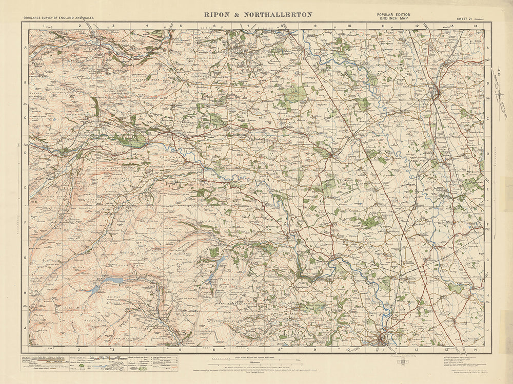 Este mapa antiguo de Ordnance Survey, hoja 21 - Ripon y Northallerton, 1925, ofrece una fascinante visión del pasado, mostrando los pueblos, ciudades y características interesantes de Ripon y Northallerton y sus alrededores. Este mapa, que forma parte de la edición "Popular" de una pulgada para Inglaterra y Gales, publicada en 1925, ofrece un valioso recurso histórico para los entusiastas de la historia, los cartógrafos y cualquier persona interesada en explorar el rico patrimonio de la región.