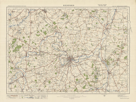Este mapa de Old Ordnance Survey, hoja 84 - Bedford, 1925, ofrece una visión fascinante del pasado, lo que le permite explorar los pueblos, ciudades y características interesantes del área de Bedford en Inglaterra. Este mapa es parte de la edición "Popular" de una pulgada de Ordnance Survey, que se publicó en 1925. El título del mapa refleja su número de hoja específico, cubre la región alrededor de Bedford e incluye lugares destacados como St Neots, Biggleswade , Sandy, Newport Pagnell y Rushden.