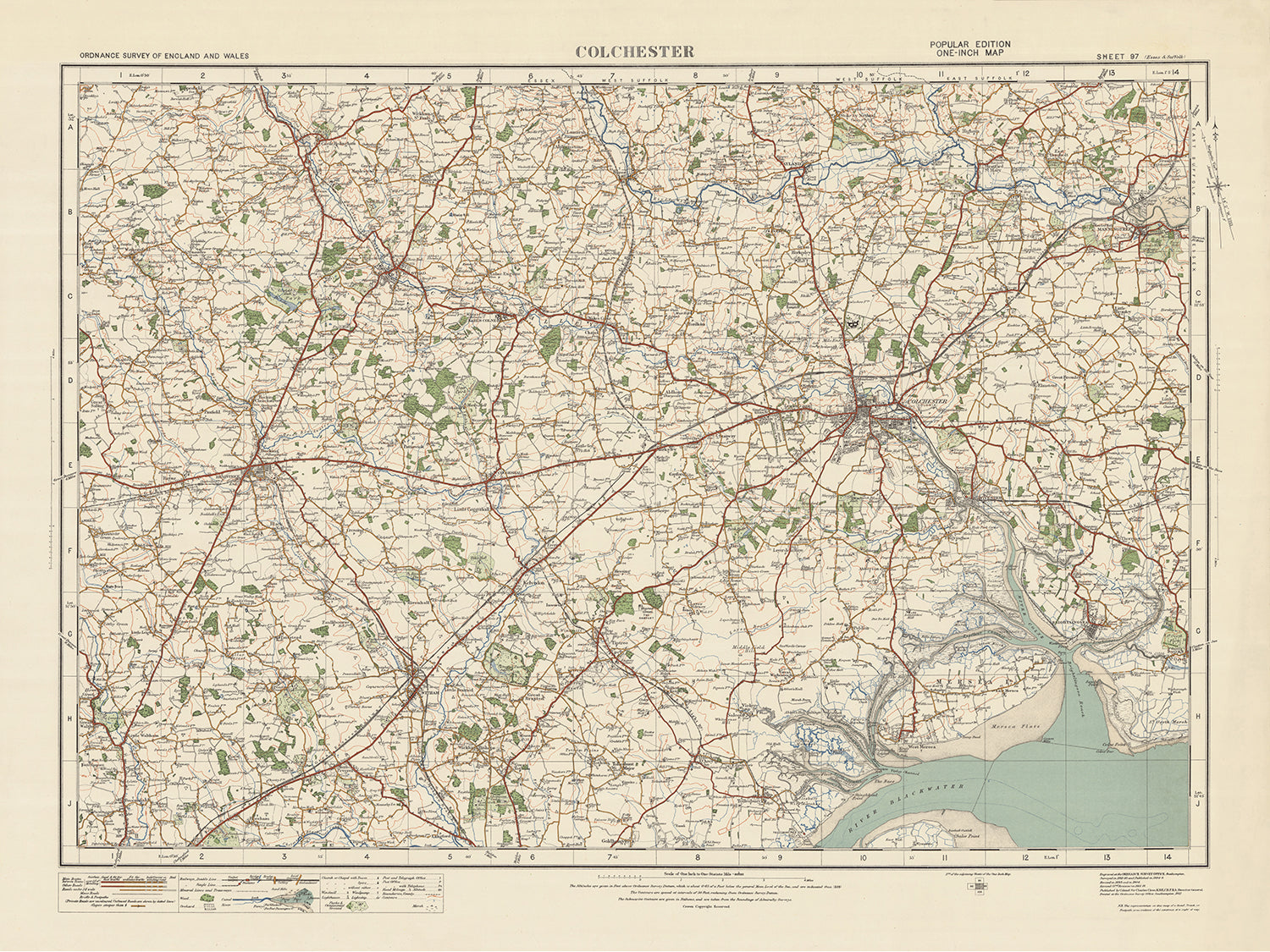 Mapa de Old Ordnance Survey, hoja 97: Colchester, 1925: Brightlingsea, Braintree, Halstead, Witham, Dedham Vale AONB