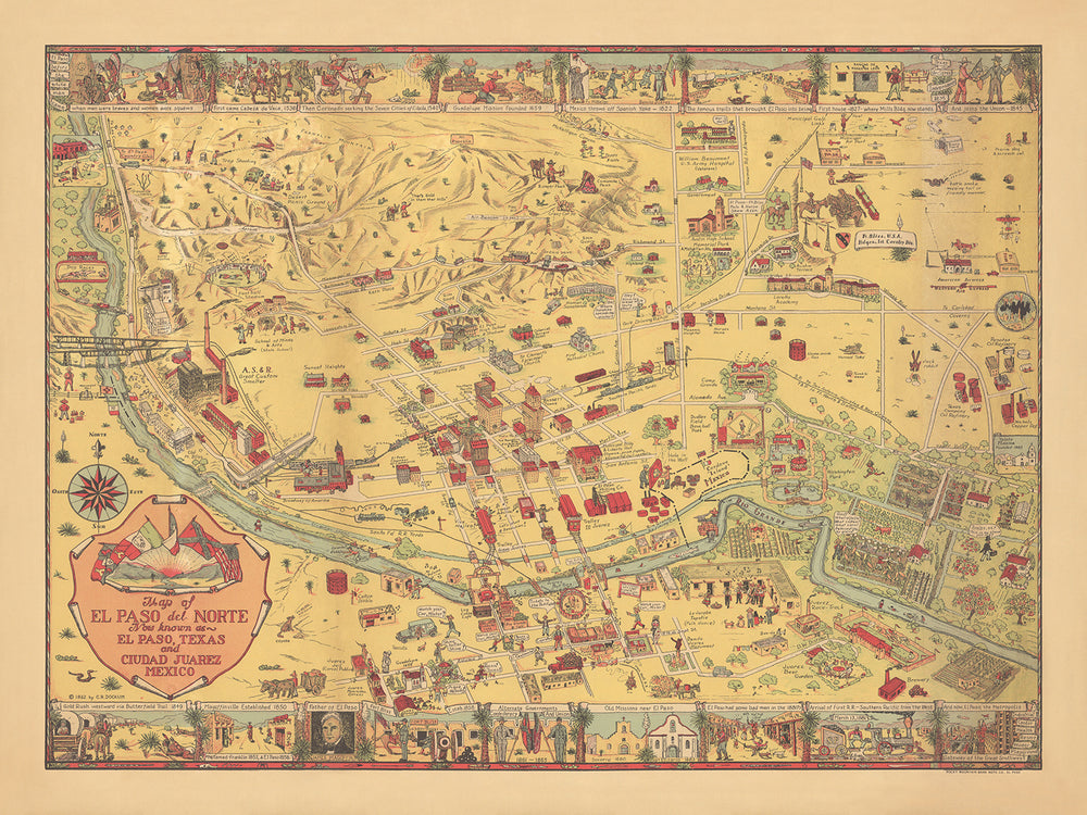 Retrocede en el tiempo con este exquisito mapa pictórico de 1932 de El Paso del Norte, también conocido como El Paso, Texas, y Ciudad Juárez, México, elaborado por el renombrado cartógrafo C.R. Dockum. Este mapa informativo en vista aérea es un viaje visual a través de la rica y diversa historia de esta única región fronteriza. El mapa está adornado con ilustraciones detalladas que capturan eventos significativos, como el establecimiento de la Misión Guadalupe en 1659 y la entrada de El Paso en la Unión en 1845, proporcionando una fascinante visión del pasado.
