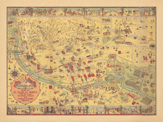 El diseño intrincado del mapa destaca los hitos históricos y culturales clave que han dado forma a la región. Desde el histórico Camino Real, una ruta comercial vital, hasta las majestuosas Montañas Franklin, cada elemento está meticulosamente ilustrado. El mapa también presenta el icónico Puente El Paso del Norte, que conecta las ciudades hermanas a través del Río Grande, simbolizando el vínculo duradero entre los Estados Unidos y México. Cada hito, desde la Misión Ysleta hasta el bullicioso Union Depot, cuenta una historia de crecimiento, resiliencia y fusión cultural.