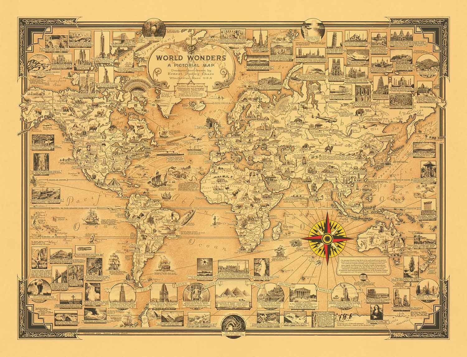 Este mapa pictórico de Earnest Dudley Chase, publicado originalmente en 1939, muestra en glorioso detalle todas las maravillas del mundo, ¡incluyendo las Siete Maravillas del Mundo Antiguo!