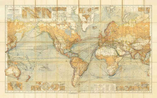 He aquí el mejor mapa de "logística" o transporte del siglo XIX. Publicado originalmente en 1873 por Hermann Berghaus, este mapa se centra en las rutas de envío, las corrientes oceánicas, los ferrocarriles y más.