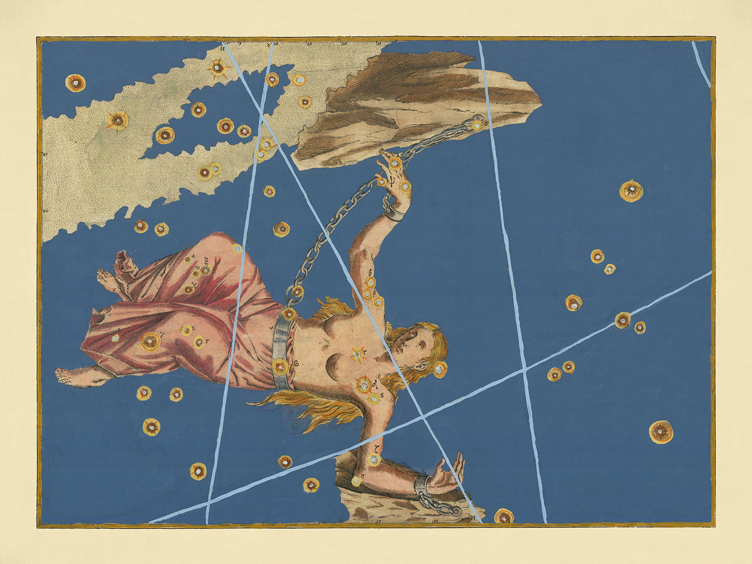 Bayer empleó un sistema de identificación de estrellas mediante letras griegas y romanas, un método que todavía se utiliza en la actualidad. Su adopción de las meticulosas observaciones de estrellas de Tycho Brahe y Keyser solidificó aún más la precisión e importancia de su trabajo. El gráfico en sí es un deleite visual; Los grabados coloreados a mano capturan maravillosamente la figura mitológica de Andrómeda, acentuada con detalles intrincados y tonos sutiles que dan vida a la constelación.