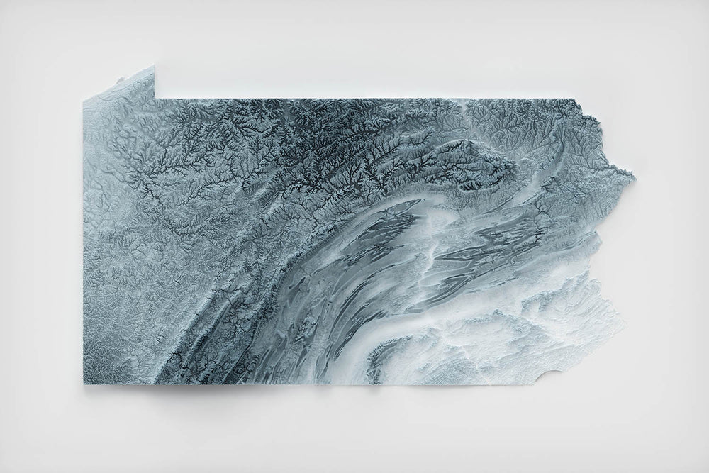 Los caminos sinuosos de los ríos Susquehanna y Delaware están grabados con suaves depresiones, sus valles aparecen hundidos entre las tierras más altas, guiando la vista a través del paisaje de Pennsylvania. Características notables como las Montañas Pocono y las Highlands de Laurel cobran vida con un relieve pronunciado, permitiéndote apreciar su prominencia y posición.