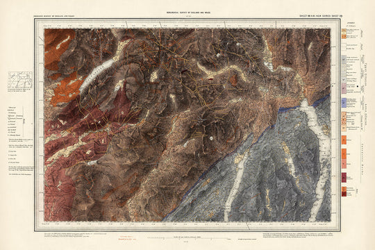El cartógrafo, el Servicio Geológico de Gran Bretaña e Irlanda, era conocido por su dedicación a la precisión y el detalle. Esta organización desempeñó un papel fundamental en el avance de la comprensión geológica durante la era victoriana. La coloración geológica pintada a mano en este mapa resalta tanto la geología de roca 'sólida' como los depósitos de 'drift', como turba y formaciones glaciares. Este enfoque meticuloso aseguró que cada mapa no solo fuera una herramienta para el estudio científico, sino también una obra de arte, reflejando los tonos vibrantes y los patrones intrincados del mundo natural.