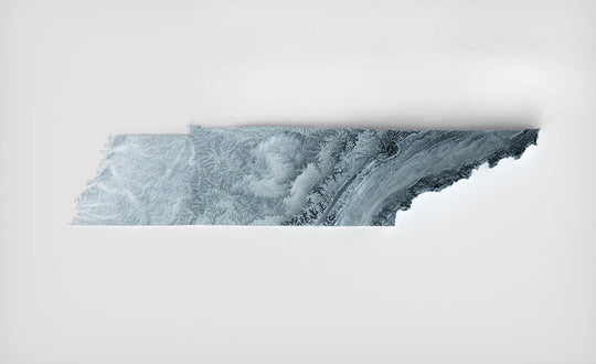 Experimenta la riqueza del paisaje de Tennessee con este mapa de relieve finamente detallado, diseñado para mostrar la notable diversidad geográfica del estado. El uso magistral de la luz y la sombra en el mapa da vida a cada pico, cresta y valle, destacando tanto la grandiosidad abrumadora como las sutiles ondulaciones de la topografía de Tennessee.