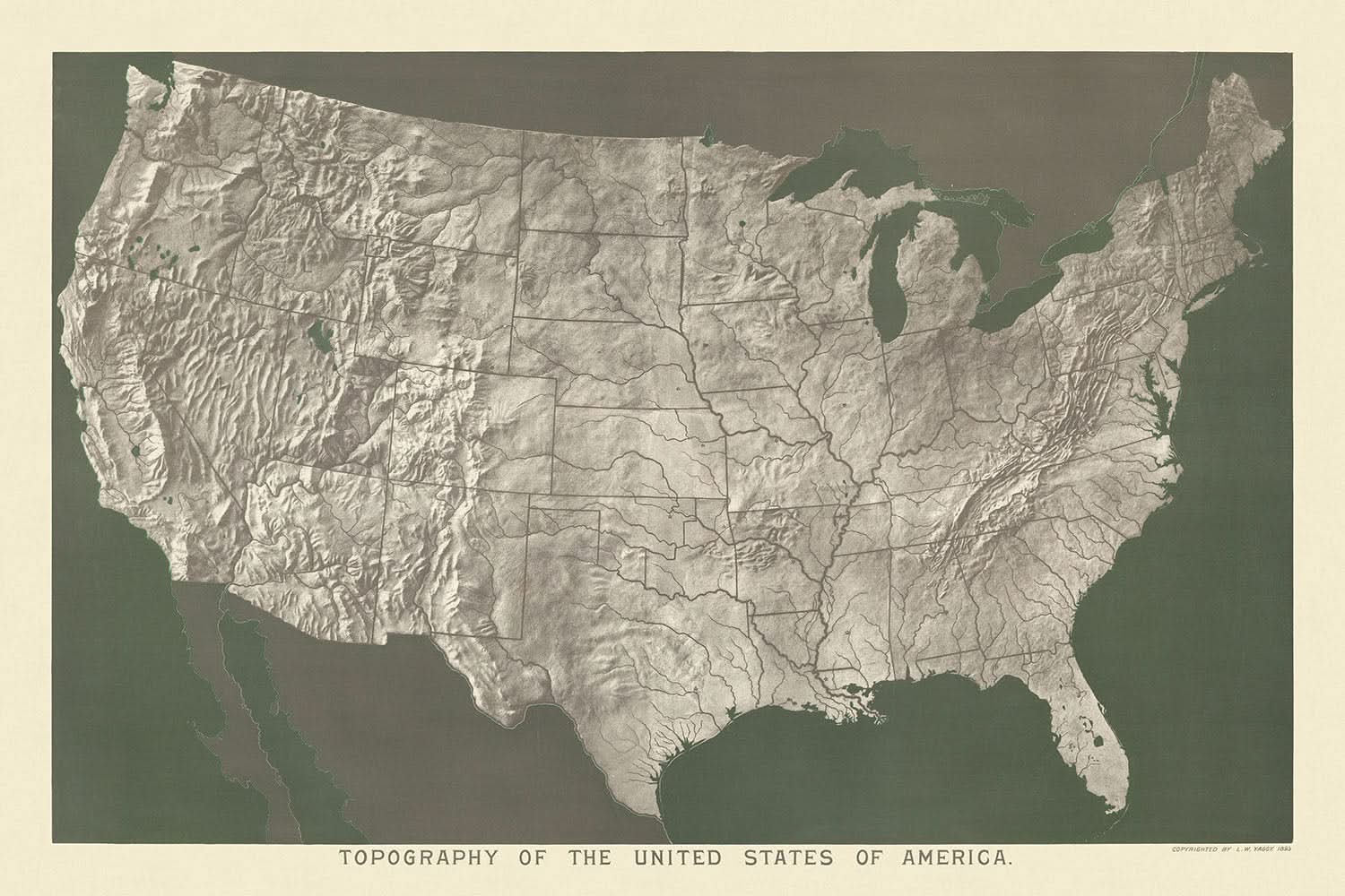 Topografía de los Estados Unidos de América, creada por Levi Walter Yaggy en 1893, es una obra impresionante que captura los intrincados paisajes y ciudades de su época. Yaggy era famoso por sus impresionantes cartas educativas del siglo XIX, en las que utilizaba cromolitografía avanzada para introducir colores vibrantes y contrastes llamativos en sus representaciones del mundo. Sus obras, incluida esta carta, fueron diseñadas para ser herramientas educativas en las aulas, reflejando la belleza y la complejidad de los estudios geográficos.