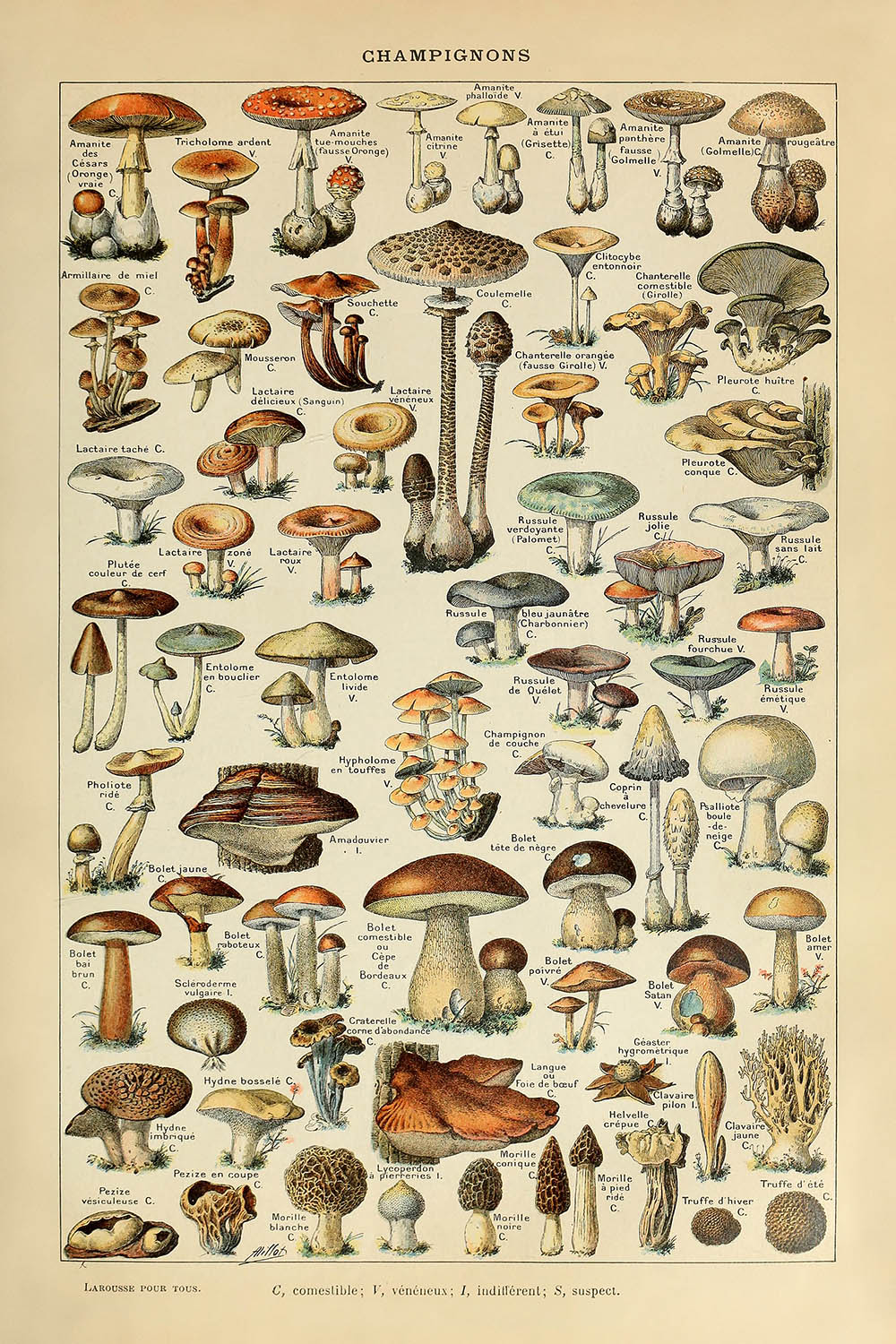 Le "Champignons" d'Adolphe Millot, publié pour la première fois en 1890, est une magnifique illustration botanique victorienne qui fait vivre le monde fascinant des champignons. Cette œuvre présente une merveilleuse sélection de croquis de champignons publiés à l'origine dans "Le Larousse pour tous : nouveau dictionnaire encyclopédique," un chef-d'œuvre de Millot. À travers ces illustrations détaillées et esthétiquement plaisantes, Millot offre un festin visuel qui met en évidence la diversité et la beauté des champignons dans le monde naturel.