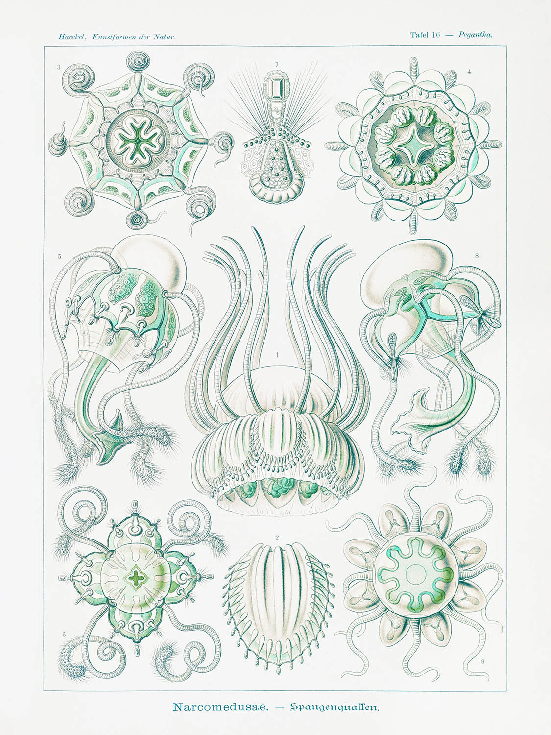 Ernst Haeckel était un biologiste et artiste accompli, renommé pour ses représentations époustouflantes et scientifiquement précises de diverses formes de vie marine. Son héritage comprend la classification pionnière de d'innombrables espèces, et son œuvre fait le pont entre la science et l'art de manière remarquable. Narcomedusae Spangenquallen (Tafel 16) est l'une de ses œuvres captivantes, mettant en valeur la beauté éthérée des méduses avec des lignes délicates et des teintes vibrantes.