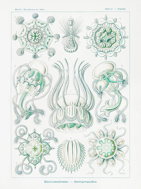 Narcomedusae Spangenquallen (Tafel 16) est une illustration scientifique fascinante d'Ernst Haeckel, publiée à l'origine en 1904 dans le cadre de son illustre "Kunstformen der Natur". Cette œuvre particulière présente diverses espèces de méduses finement détaillées, reflétant l'admiration profonde de Haeckel pour le monde naturel.