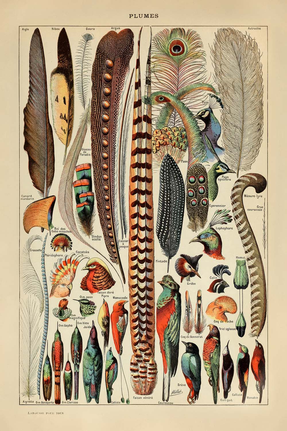 "Plumes" est particulièrement notable pour son impressionnante précision zoologique, affichant une variété de plumes d'espèces d'oiseaux diverses, chacune soigneusement étiquetée dans une élégante écriture française. Les espèces représentées dans cette illustration incluent :