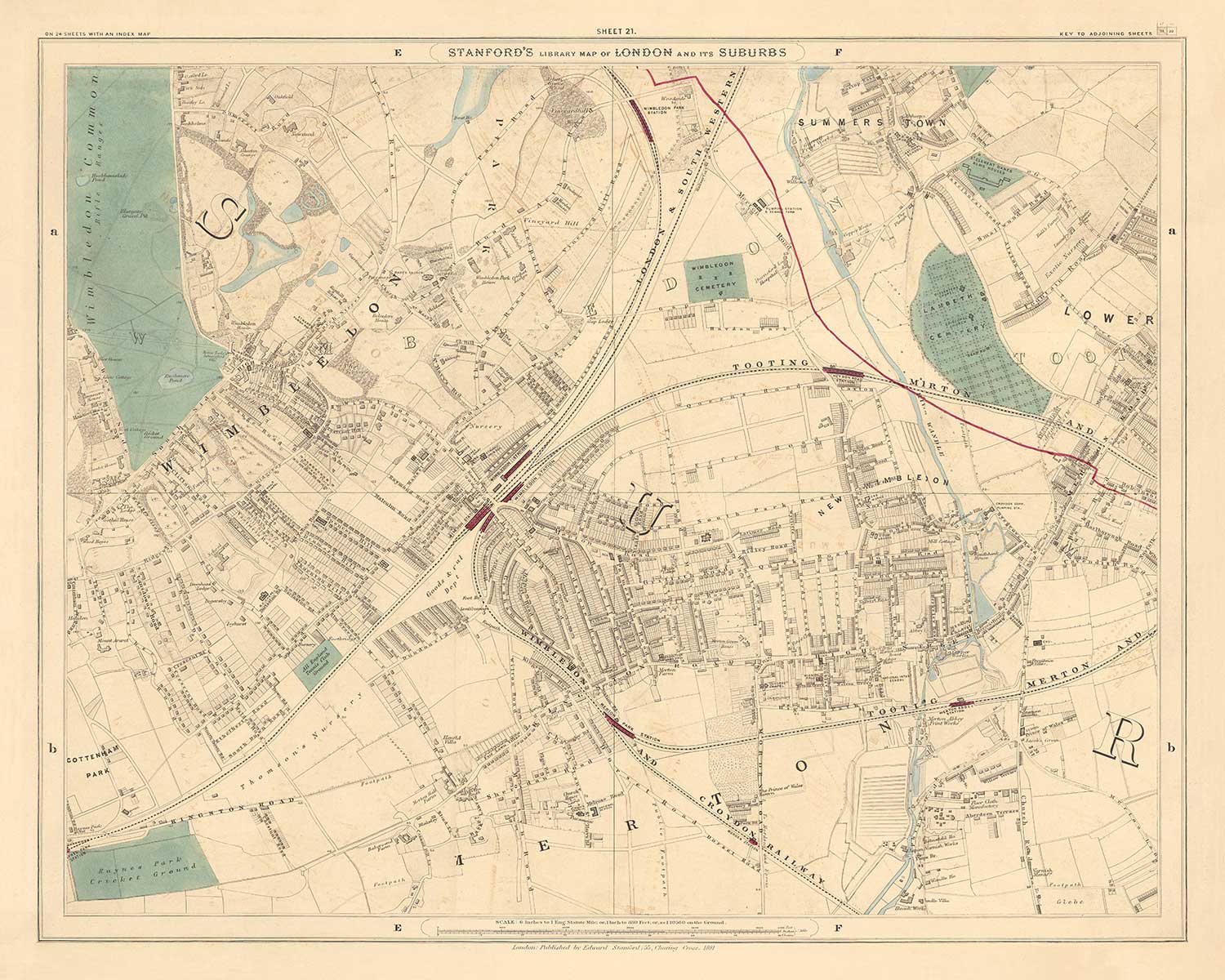 La carte a été initialement publiée en 24 feuilles. Au total, la carte mesurait environ 2 mètres de large (78 pouces). Voici la feuille 21, qui se concentre sur les arrondissements du sud-ouest de Londres, Merton, Wandsworth et Lambeth.