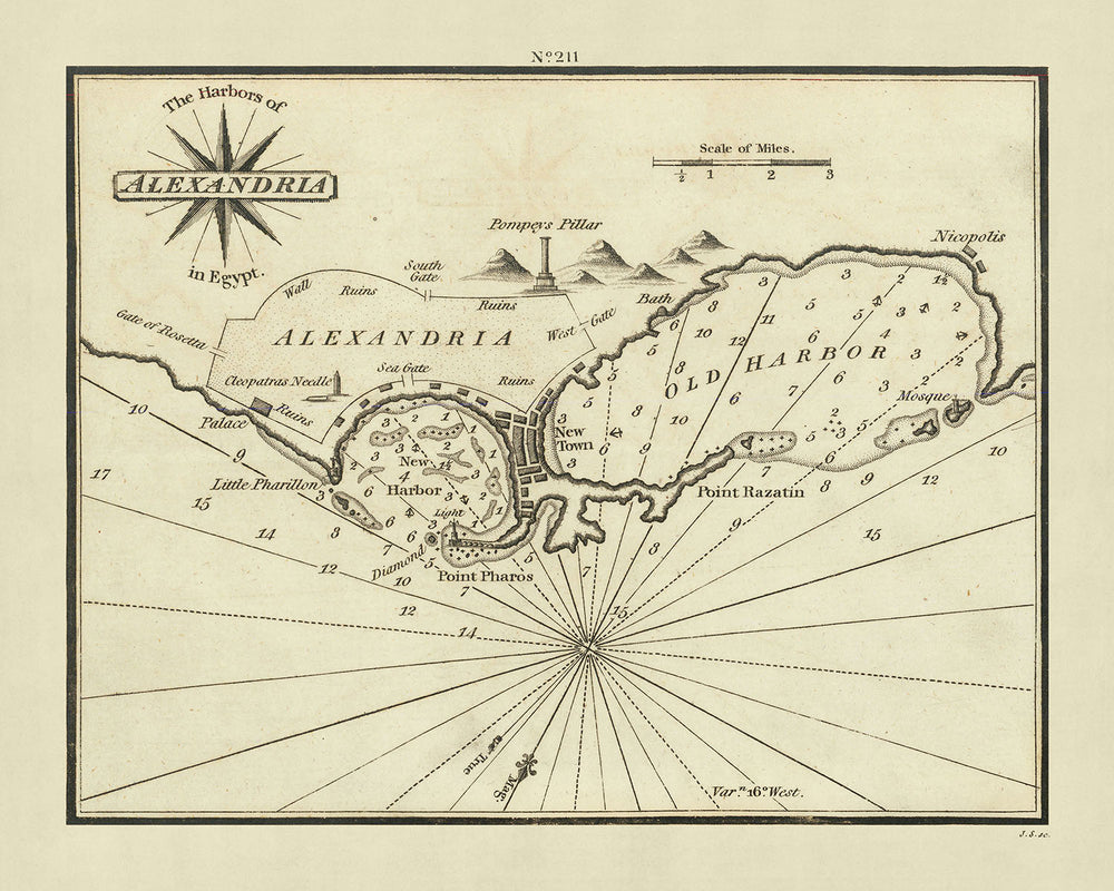 Ancienne carte nautique du port d'Alexandrie par Heather, 1802: L'aiguille de Cléopâtre, La colonne de Pompée, Mosquée