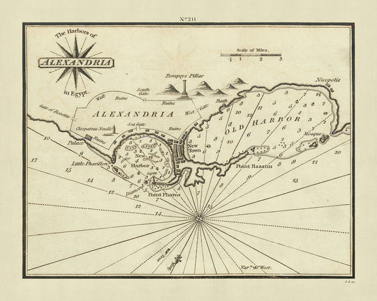 De plus, la carte n'hésite pas à mettre en valeur le patrimoine architectural d'Alexandrie. Elle marque avec soin les emplacements des murs de la ville, des portes, et même des rues anciennes, aux côtés de ruines notables telles que la Colonne de Pompée, l'Aiguille de Cléopâtre et Nicopolis. Ces éléments non seulement guident le marin, mais éduquent également l'historien, l'archéologue et le voyageur curieux sur la riche tapisserie des récits historiques que représente Alexandrie.