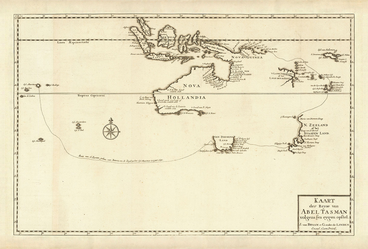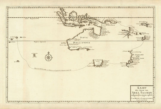 Cette carte se concentre spécifiquement sur le premier voyage d'Abel Tasman, le premier Européen à entrer en contact avec la Nouvelle-Zélande et la Tasmanie.