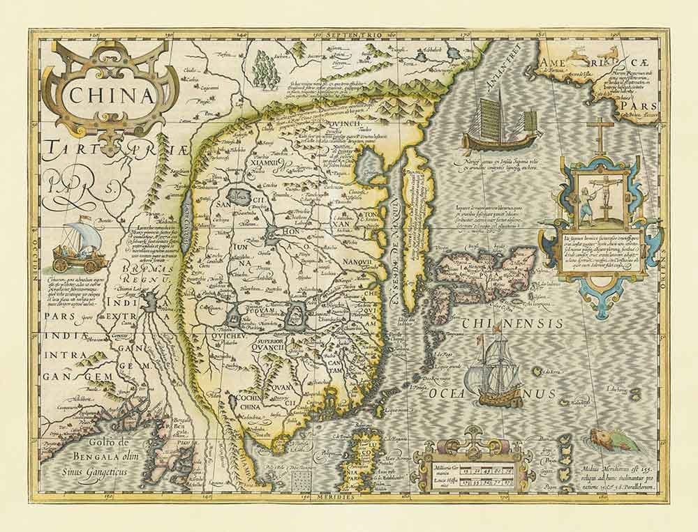 Une carte véritablement magnifique de la Chine de 1606 par le maître cartographe néerlandais Jodocus Hondius - probablement la plus belle ancienne carte de la Chine jamais créée. Une grande partie de l'Asie de l'Est peut également être vue sur cette carte, y compris la Corée en tant qu'île (!), le Japon, les Philippines, et même un peu du nord-ouest de l'Amérique du Nord.