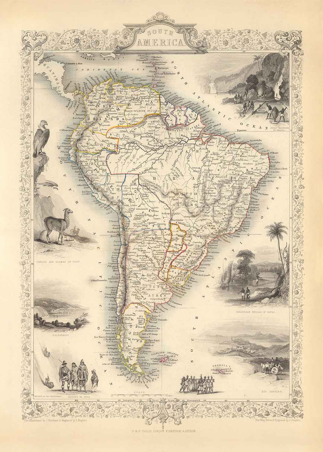 Autour de la carte se trouvent également des illustrations détaillées du célèbre lavage de l'or brésilien où 800 tonnes métriques d'or ont été envoyées au Portugal, les autochtones du Chili, le rafting sur les rivières des Cordillères, et le condor, qui est l'oiseau national de nombreux pays sud-américains tels que l'Équateur et la Colombie, ainsi que les lamas du Pérou.