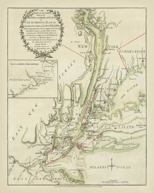 - Nom de la carte : Le Siège d'Action entre les Forces britanniques et américaines. Ou un Plan Authentique de la Partie Ouest de Long Island, Avec l'engagement du 27 août 1776 entre les Forces du Roi et les Américains . . . d'après les relevés du Major Holland.