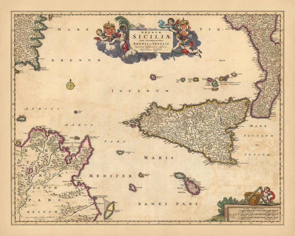 Ancienne carte du royaume de Sicile par Visscher, 1690 : Palerme, Catane, Tunis, Malte, Parco dell'Etna