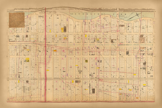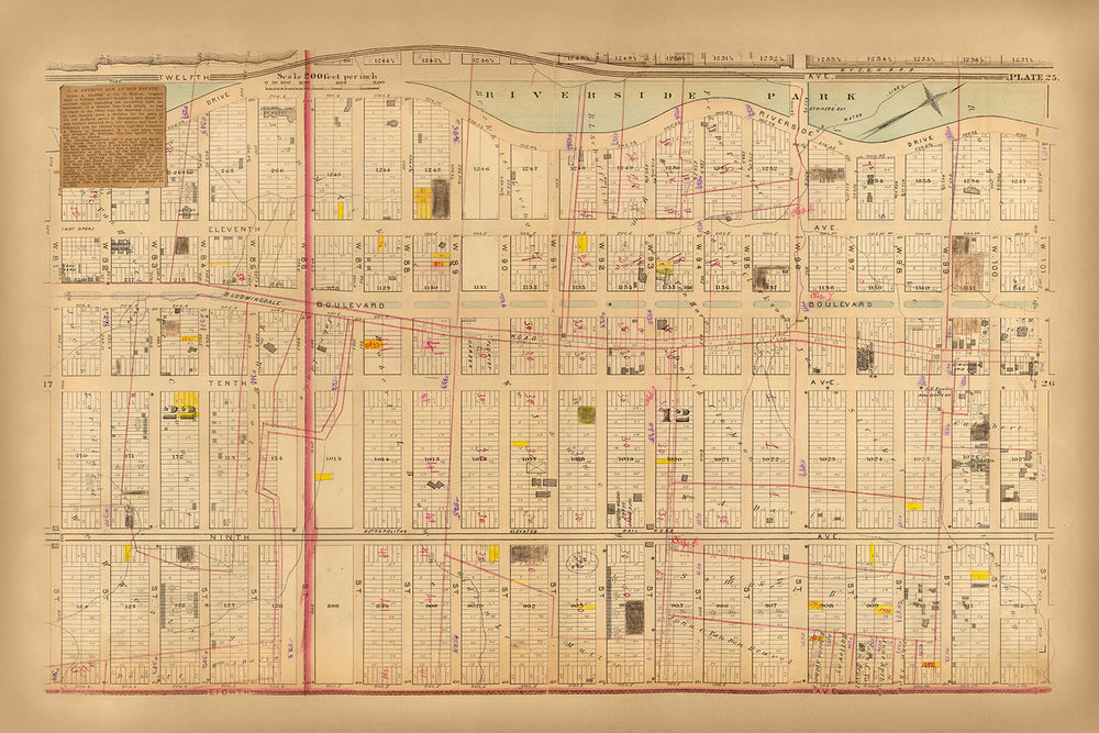 Riverside Park, un espace vert important de la région, est mis en évidence, offrant aux spectateurs contemporains une idée des paysages récréatifs dont disposaient les New-Yorkais de l'époque. Le boulevard, aujourd'hui connu sous le nom de Broadway, coupe la carte en deux, révélant son importance en tant qu'artère même au XIXe siècle. Cette carte met également en lumière les conduites d'eau principales d'origine et l'emplacement des bouches d'incendie, indiquant les premières infrastructures qui soutenaient la croissance de la ville. Les tons roses et jaunes utilisés pour désigner divers types d'utilisation des terres et les annotations ajoutées à la carte enrichissent encore le récit historique contenu dans cette seule feuille.