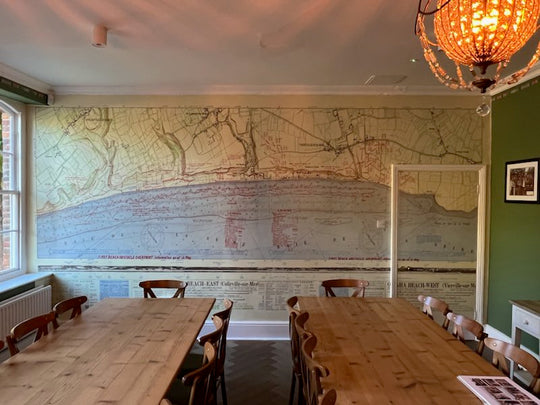 Émis moins d'un mois avant le jour J et portant la classification ultra-secrète "BIGOT", ces cartes ont été essentielles dans la planification et l'exécution de l'invasion alliée de la Normandie. La carte de base est une carte topographique familière, avec des routes et des zones bâties en noir, le vert indiquant différents types de végétation ; et le brun indiquant les élévations et les caractéristiques topographiques, y compris les falaises escarpées surplombant la plage. Une variété de lignes en pointillés dans l'eau indique les profondeurs à marée basse (brun) et à marée haute (bleu).