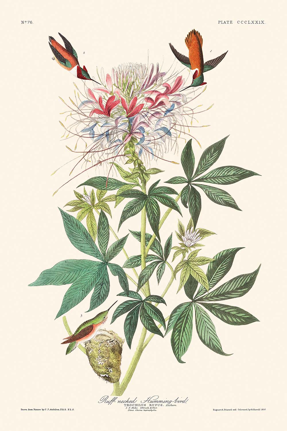 Cette impression de colibri captive par son réalisme incroyable et ses couleurs vives. Les riches teintes de cannelle et de vert émeraude se juxtaposent de manière spectaculaire avec le rouge ardent de la gorge de l'oiseau, presque semblable à un bijou par sa brillance. Les détails méticuleux du travail d'Audubon confèrent à chaque plume une texture réaliste, capturant l'essence éthérée et l'agilité de l'oiseau en vol. Aux côtés de cet oiseau exquis se trouve la plante Cleome heptaphylla, ajoutant une dimension supplémentaire et un contexte écologique.