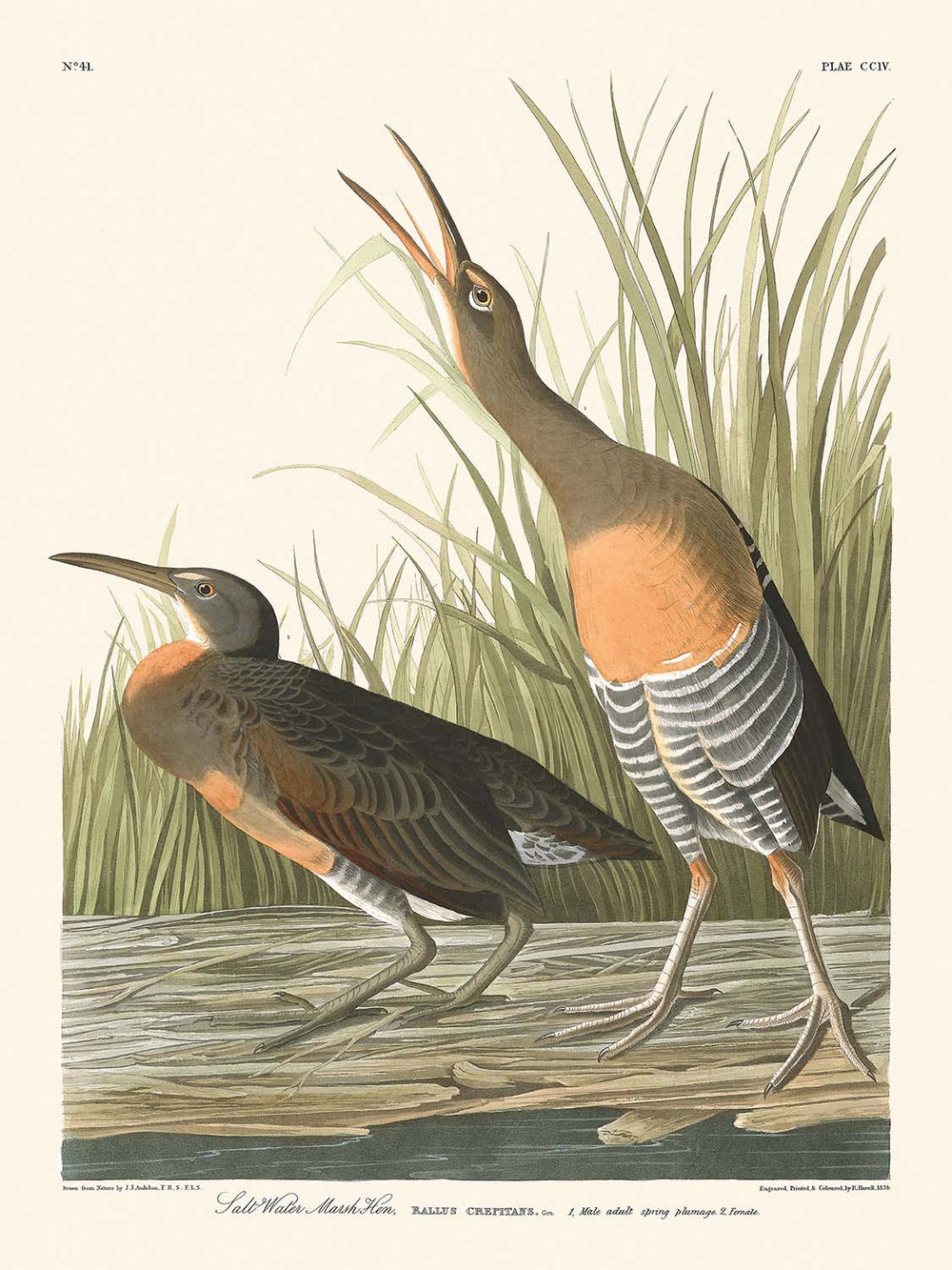 John James Audubon est célébré pour ses représentations détaillées et réalistes des espèces d'oiseaux, qui sont devenues à la fois éducatives et artistiquement significatives. Sa série Oiseaux d'Amérique est un pilier de la littérature et de l'art ornithologique. Cette illustration capture le Râle de Clapper (Rallus crepitans), connu localement sous le nom de Gallinule de Marais Salé, dans des détails complexes, mettant en valeur l'habileté d'Audubon avec la couleur et la forme.