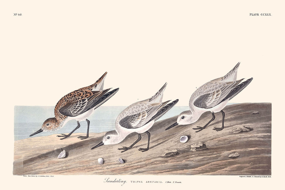 Le Sanderling, ou Calidris arenaria, est un petit oiseau limicole, souvent trouvé le long des plages de sable et des côtes, cherchant de la nourriture avec son distinctif mouvement rythmique de fouille dans les sables. La représentation d'Audubon illustre remarquablement ces caractéristiques avec une utilisation frappante des couleurs qui donne vie à chaque plume. L'impression révèle une palette où les gris cendrés dominent, complétés par des bruns délicats et le subtil jeu des blancs, reflétant les teintes naturelles de l'oiseau et de son habitat. Cette illustration particulière offre un aperçu fascinant de la tapisserie écologique de la vie aviaire nord-américaine, capturant les motifs de migration saisonnière qu'Audubon a si éloquemment chroniqués dans ses œuvres.