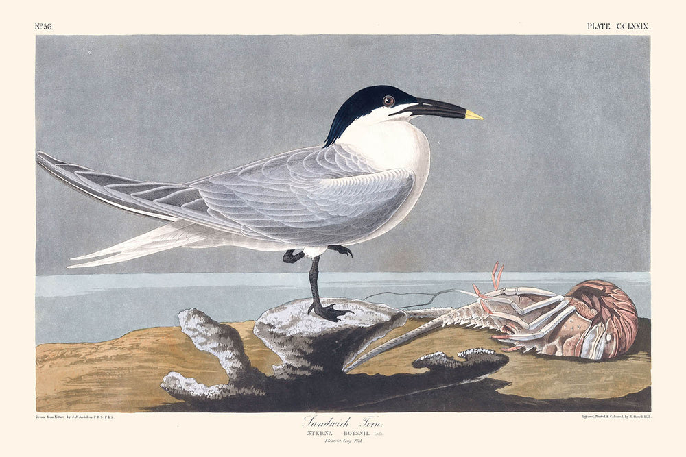 Les amateurs d'art et les passionnés de nature apprécieront cette magnifique impression d'art de “Sterne Sandwich” illustrée par le célèbre John James Audubon en 1827. Connu pour son attention méticuleuse aux détails, Audubon a entrepris de nombreuses expéditions pour capturer la vitalité des espèces aviaires américaines, la Sterne Sandwich étant une découverte particulièrement passionnante le long des Florida Keys.