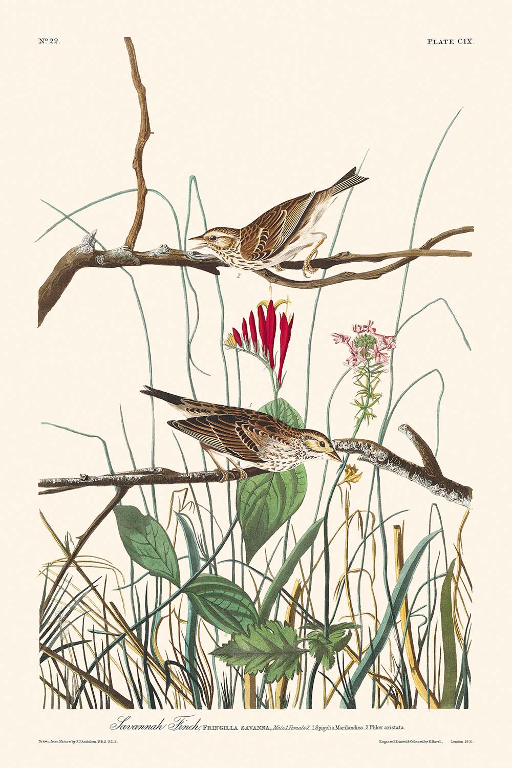 Audubon, ornithologue et artiste légendaire, a acquis une renommée internationale pour ses illustrations réalistes et captivantes d'oiseaux. Son travail sur "The Birds of America" a non seulement mis en avant son talent artistique, mais a également fourni des observations scientifiques inestimables. Le Savannah Finch, présenté de manière proéminente dans cette plaque, reflète la passion d'Audubon pour la documentation de la diversité et des comportements des espèces d'oiseaux américaines.