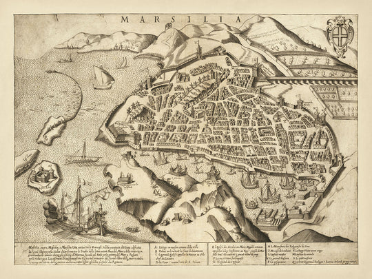 Le style pictural de la carte est non seulement visuellement attrayant mais aussi fonctionnellement informatif. Les navires parsemant le port, les fortifications entourant la ville et divers bâtiments et structures sont méticuleusement illustrés, offrant un aperçu de Marseille au 16ème siècle. La représentation détaillée des quartiers résidentiels et commerciaux donne un aperçu de l'urbanisme et de la vie quotidienne de la ville. Les espaces ouverts et les jardins intercalés dans le plan de la ville mettent en évidence le mélange de beauté naturelle et de grandeur architecturale qui définit Marseille.