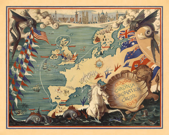 La carte illustre magnifiquement le voyage du Cunard Caronia, mettant en évidence des lieux clés tels que Londres, Douvres et Édimbourg au Royaume-Uni, ainsi que Paris, Rome et Gibraltar en Europe. Chaque ville et monument est méticuleusement représenté, mettant en valeur l'importance culturelle et historique de l'itinéraire de la croisière. L'inclusion de drapeaux de divers pays souligne le caractère international du voyage, reflétant la célébration mondiale du couronnement.