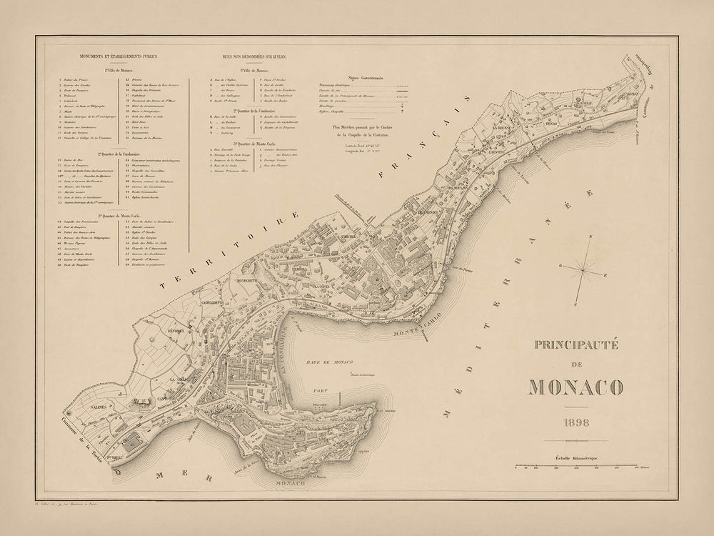 L'expertise de C. Gillot en cartographie est évidente dans la précision et l'art de cette carte. Connu pour ses cartes de ville détaillées, Gillot capture l'essence du paysage urbain de Monaco avec une clarté remarquable. Son travail offre des aperçus inestimables sur l'agencement de la ville, des rues animées comme le Boulevard de la Condamine aux chemins sereins du Chemin des Révoires, offrant une vue d'ensemble de l'évolution géographique et infrastructurelle de la principauté.