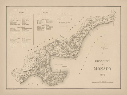 L'inclusion par la carte de points de repère significatifs tels que le Casino de Monte-Carlo et le Jardin Exotique souligne la réputation de Monaco en tant que centre de luxe et de loisirs. Ces sites iconiques ne sont pas simplement des points d'intérêt, mais sont essentiels pour comprendre les dynamiques culturelles et sociales de l'époque. Le Port de Monaco et sa zone portuaire sont également décrits avec soin, reflétant le patrimoine maritime de la principauté et son rôle clé dans le commerce.